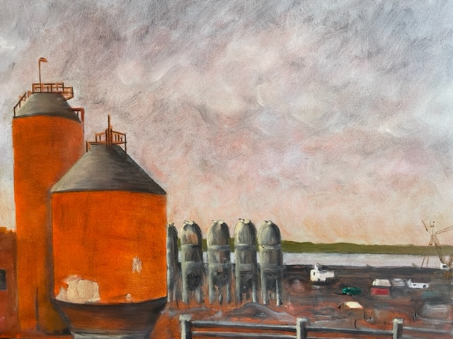Past paintings mostly were in oil; current works are encaustic and acrylic.